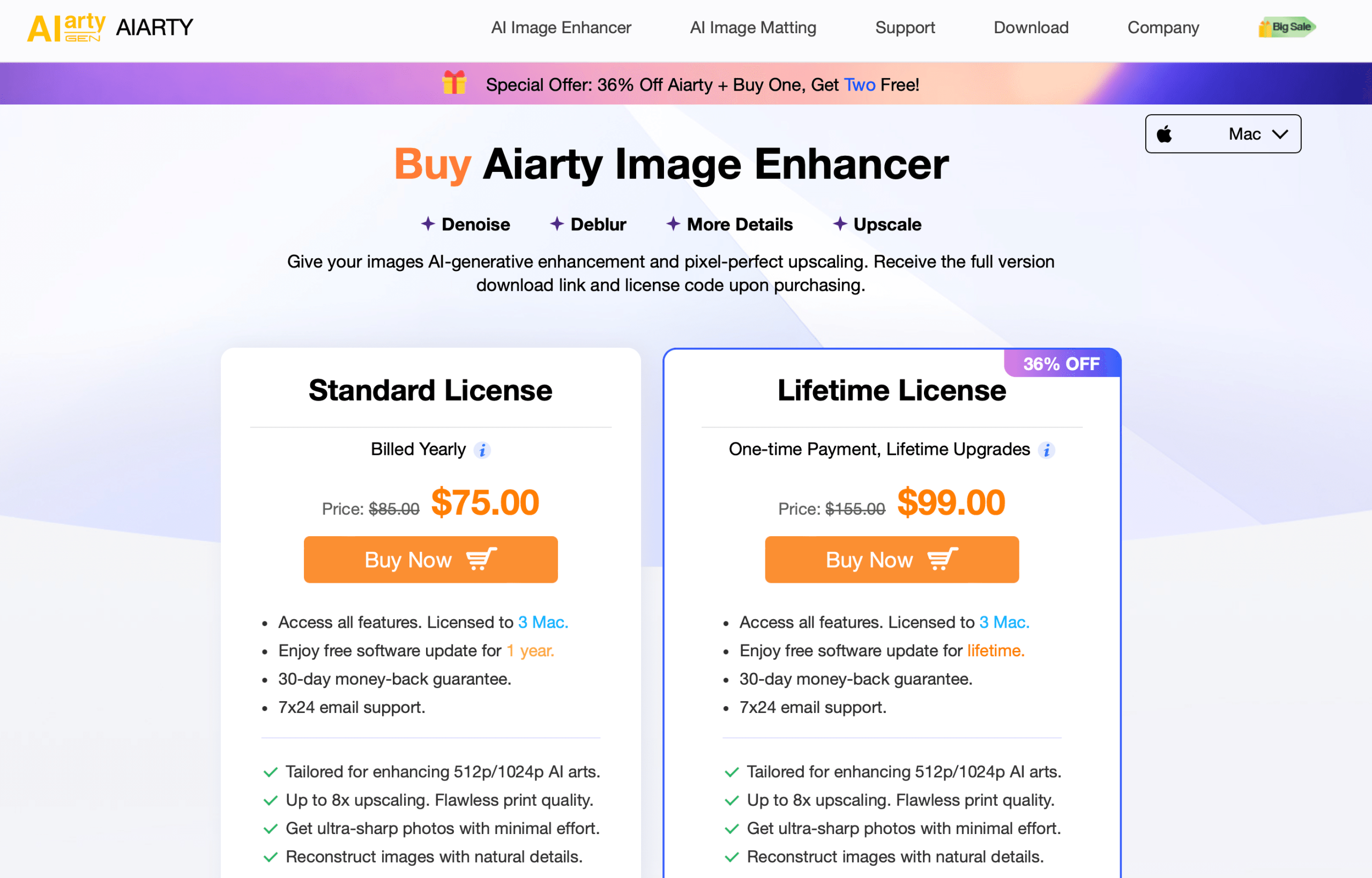 Aiartyは、Digiarty Softwareが提供する最新のフラッグシップブランドで、AI技術を駆使した画像処理ソフトウェアを提供しています。特に画像を高画質化したり、細かなノイズやピンボケを補正できるのが特徴で、画像を綺麗に仕上げたい方には非常におすすめのサービスです。