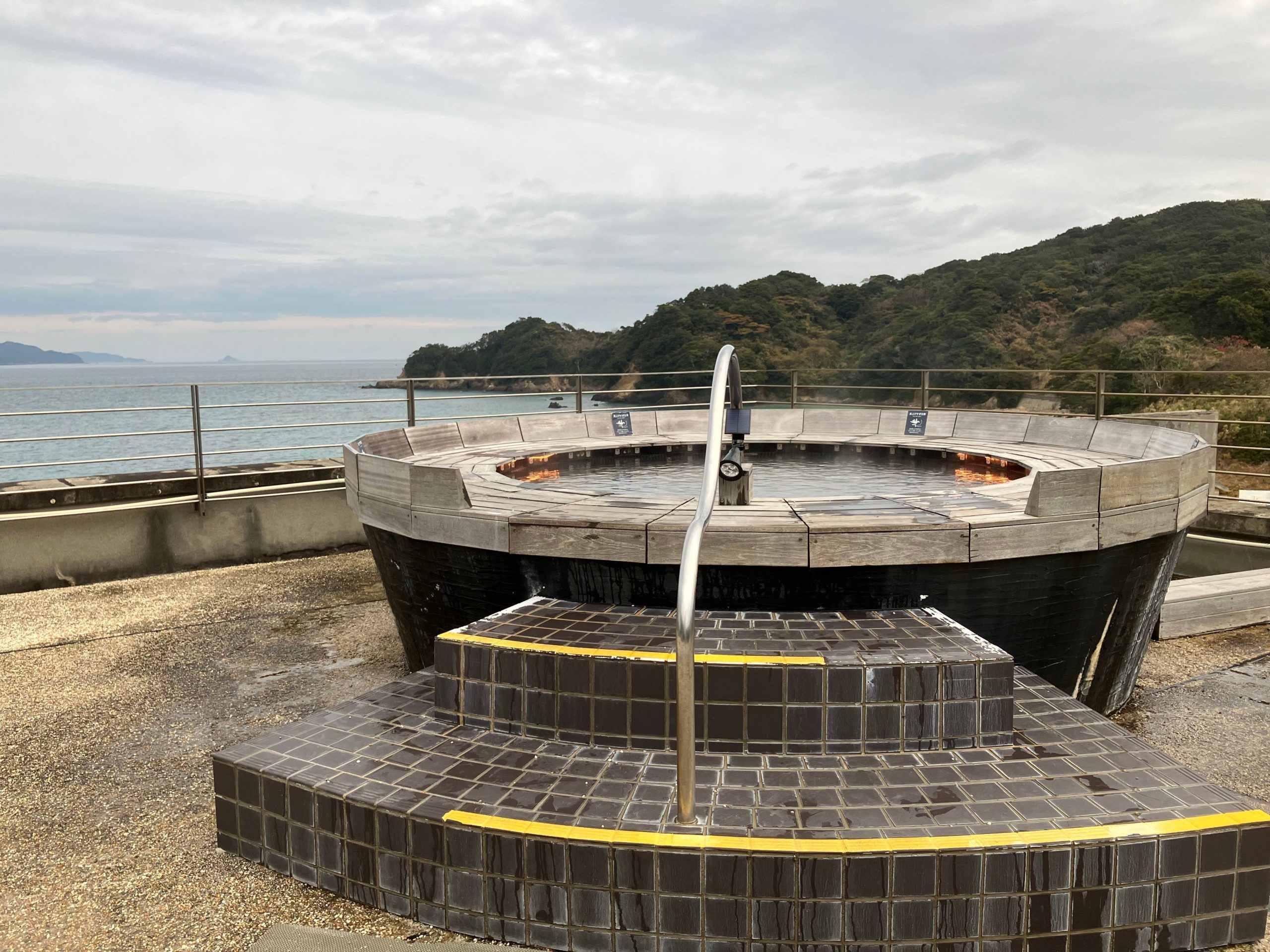 お風呂場のフロアから階段を上がると、開放的な足湯スペースがあり、海を眺めながら足湯に浸かることができます。タオルも用意されているので、手ぶらで行っても安心。