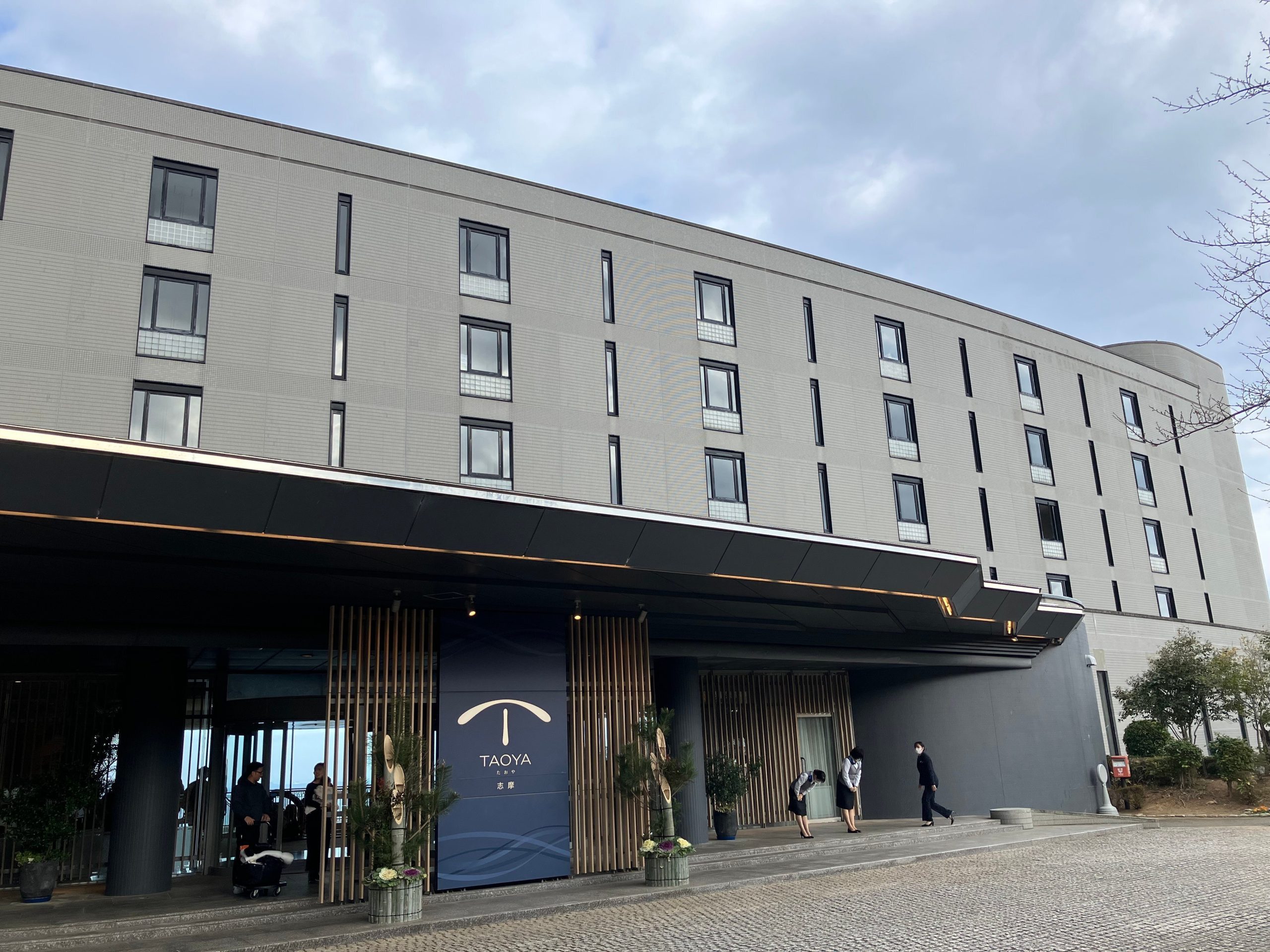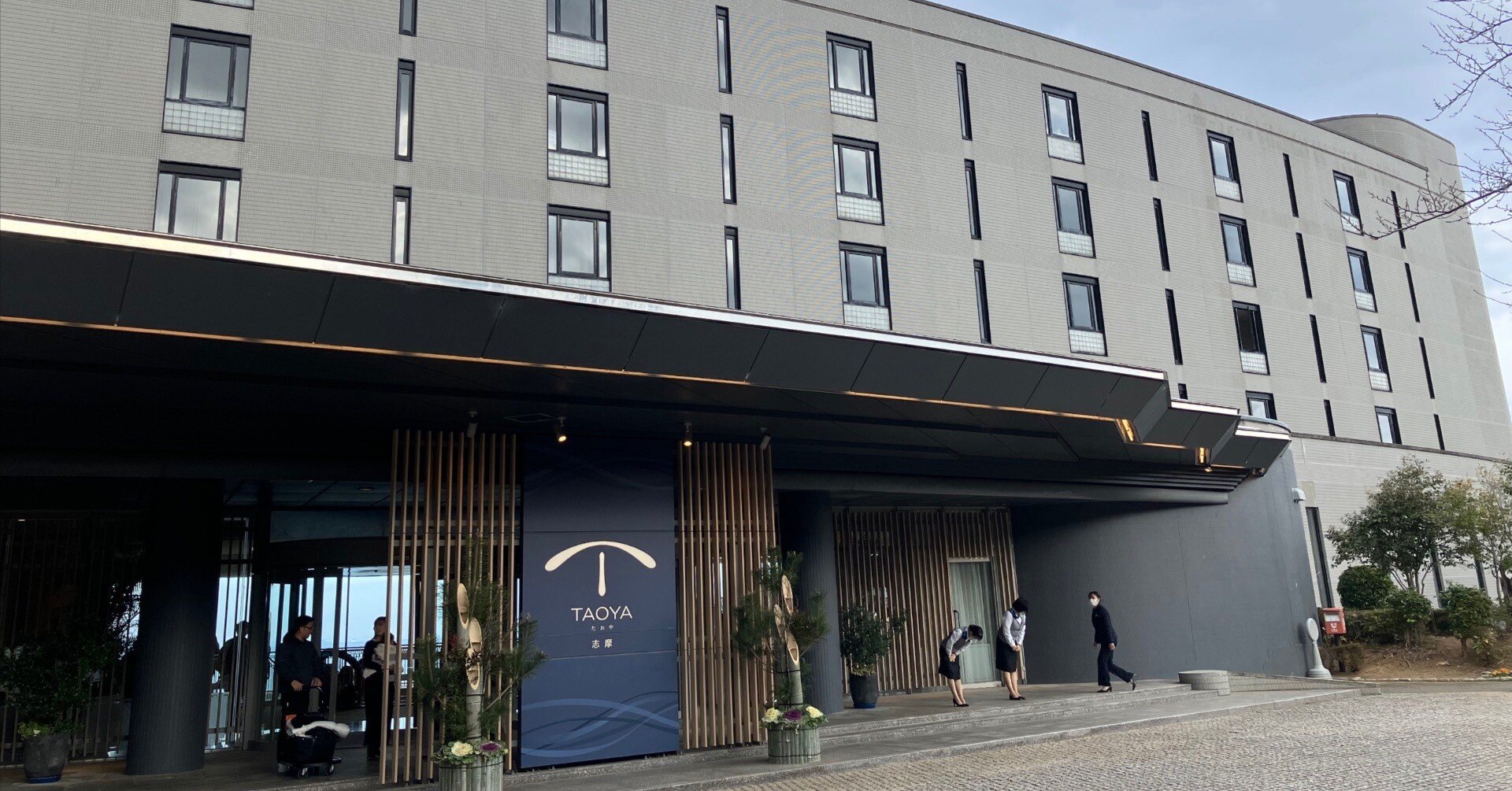 山の中を抜けると突然現れる「TAOYA志摩」。その外観は洗練されていて、リゾート感たっぷり。モダンなデザインの建物が広がり、照明に照らされたエントランスは高級感が漂っていました。