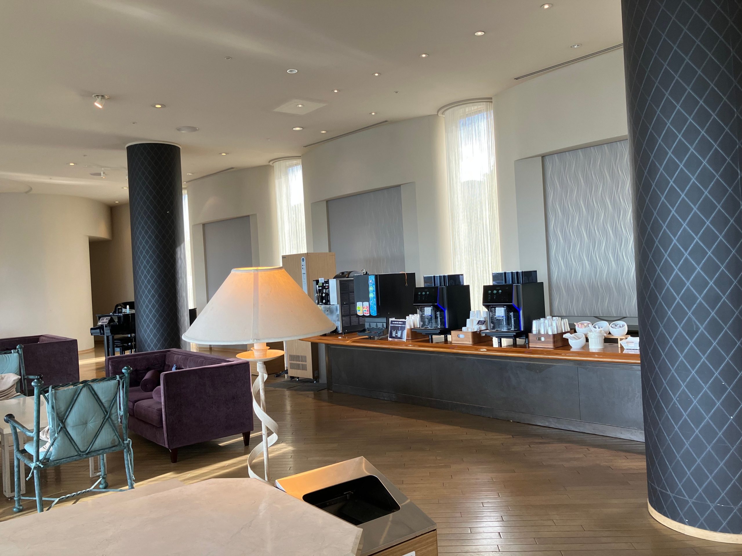 チェックアウトの時間が近づいてきたので、最後にロビーのラウンジへ。ここでは、宿泊者向けに無料でドリンクが提供されており、朝のひとときをゆったりと過ごすことができます。